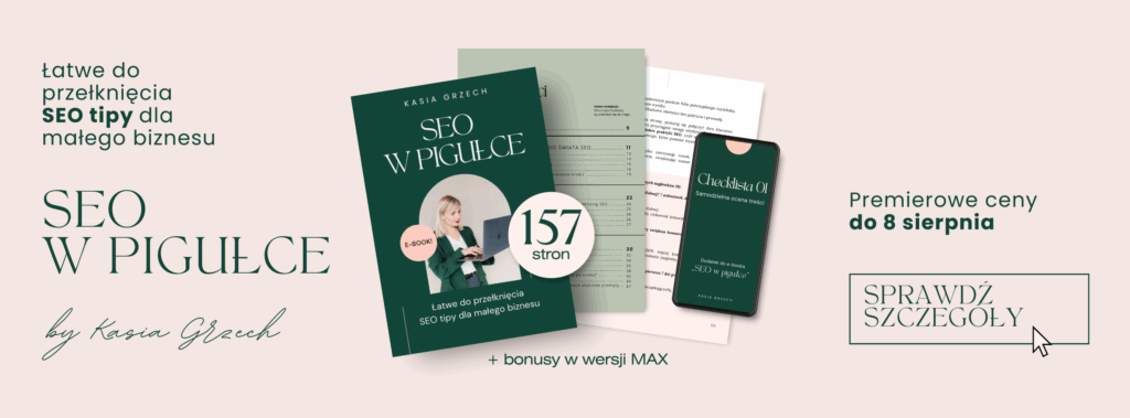 o pisaniu tekstów przyjaznych SEO, sięgnij po mojego e-booka „SEO w pigułce” – to konkretna, skondensowana dawka wiedzy, dzięki której uporządkujesz podstawy i unikniesz najczęstszych błędów.